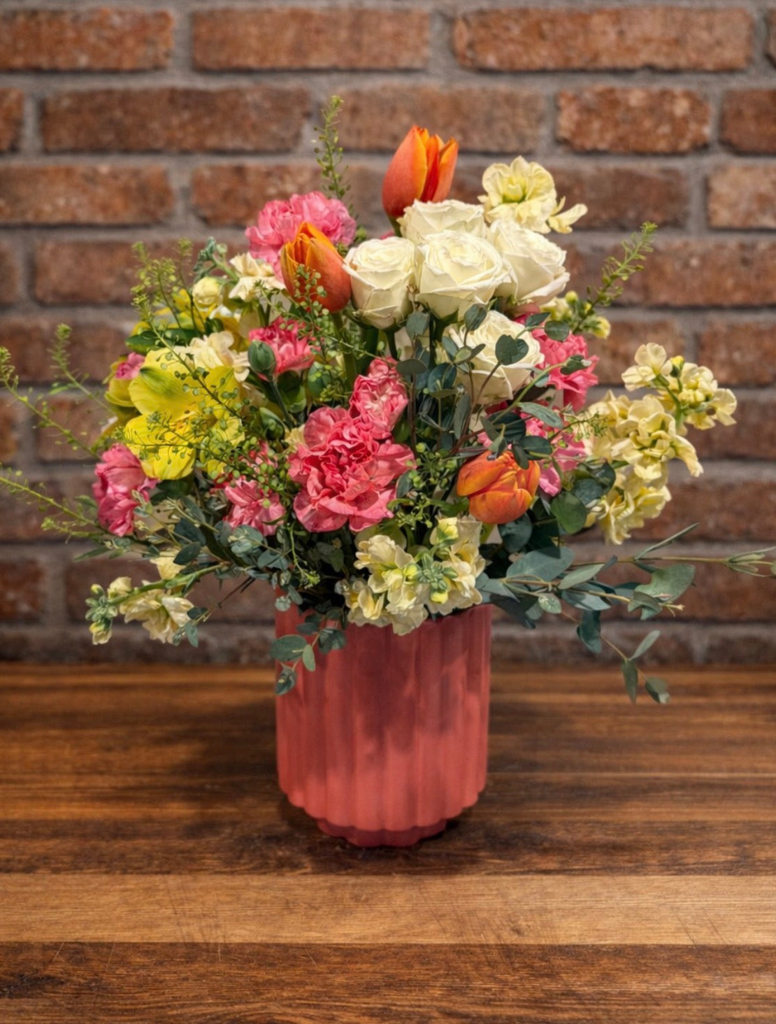 A warm mix of blush, cream, and orange blooms in a hot pink vase—rich, glowing, and naturally styled.