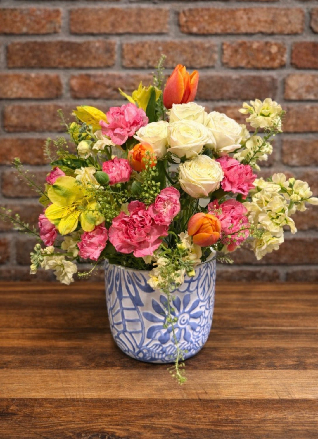 A bright mix of white, pink, yellow, and orange blooms in a patterned vase—fresh, playful, and naturally styled.