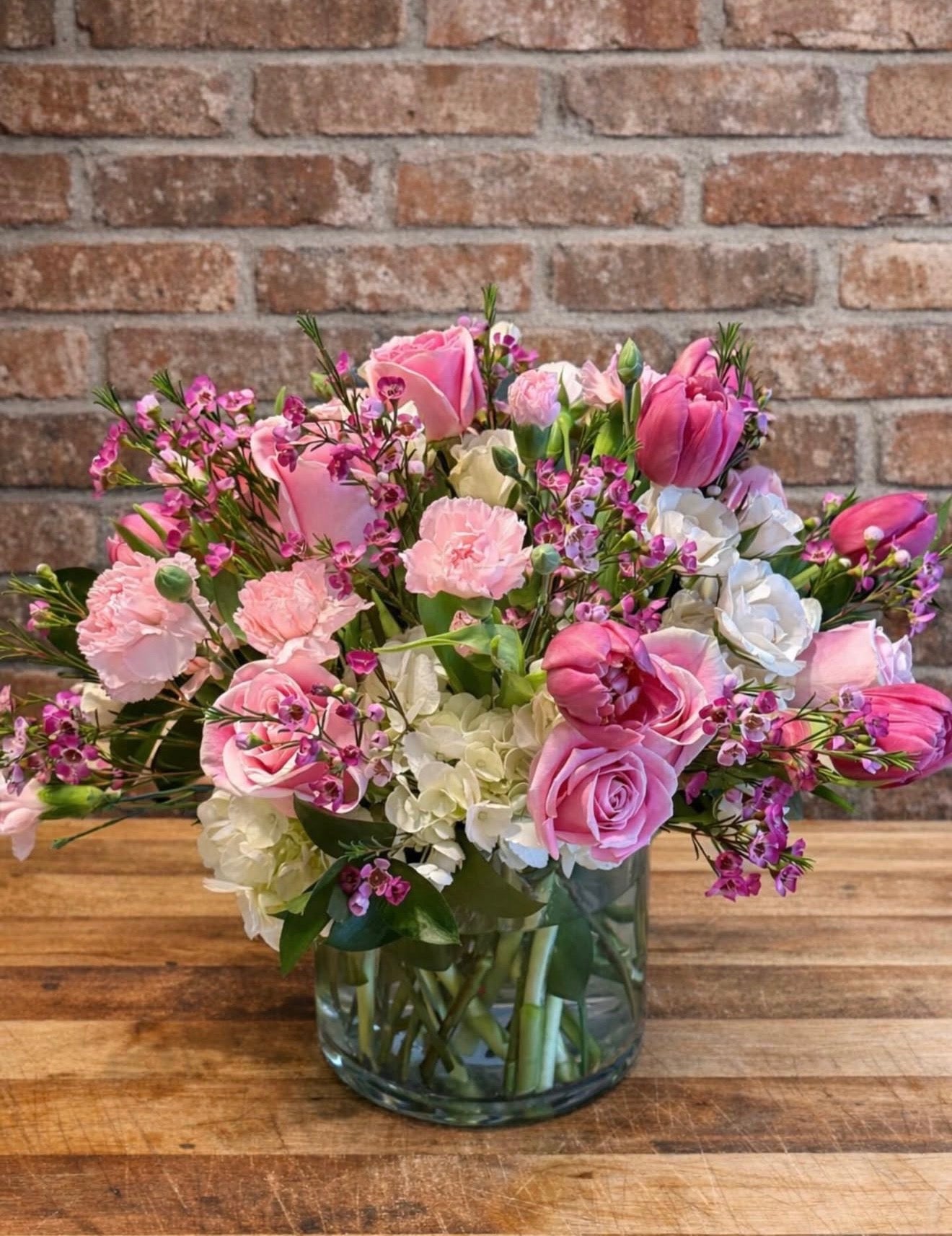 A soft mix of blush pink and white blooms in a clear vase. Airy, and naturally styled.