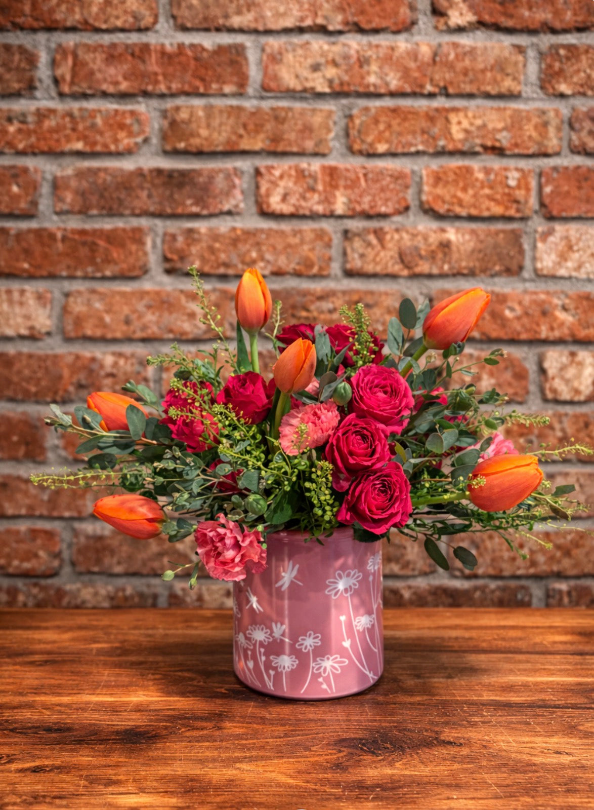 A warm, garden-style mix of hot pink roses, orange tulips, and blush blooms with fresh greenery. Full, vibrant, and perfect for everyday beauty.